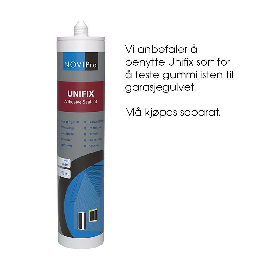 Vi anbefaler å benytte Unifix sort for å feste gummilisten til garasjegulvet.